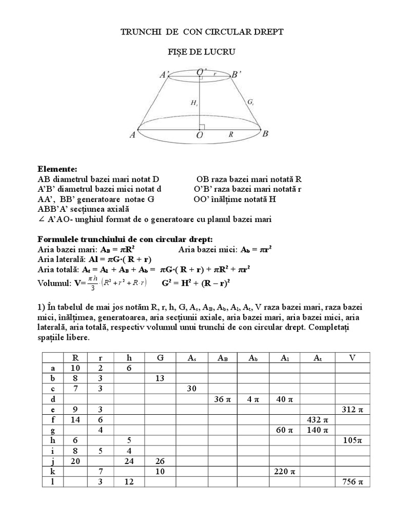 · lungimea diagonalei secțiunii axiale. Un trunchi de con circular drept are raza bazei mari de 7cm;inaltimea de 8cm;volumul 152πcm 3. Formule de geometrie in spatiu.