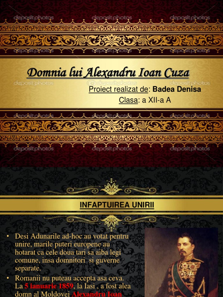 Cuza la 5 ianuarie 1859 si la 24 ianuarie 1859 la bucurești a exprimat voința națiunii și a inaugurat politica faptului împlinit. Alegerea domn al moldovei a lui alexandru ioan cuza. Ales domn al moldovei la 5 ianuarie 1859 şi apoi şi domn al ţării româneşti, pe 24 ianuarie, alexandru ioan cuza devine astfel primul domn al statului ce conştient de mandatul său şi sprijinit de oameni politici valoroşi, colonelul alexandru ioan cuza a reuşit, în cei 7 ani de domnie, să reformeze radical.