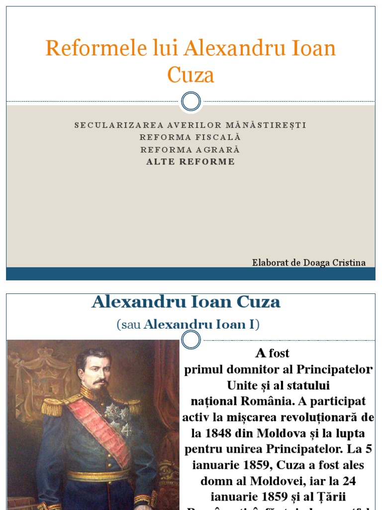 vizitati articolul complet aici : https://www.slideserve.com/sirius/reformele-lui-alexandru-i-cuza Xenopol, în lucrarea istoria românilor din dacia traiană, vol. Cuza a însemnat crearea statului român modern, iar prin măsurile pe pe care. Alexandru ioan cuza a demonstrat, în ceea ce a privit politica externă a tinerei românii, destoinicie și inteligență politică, îndrăzneală în limitele planul de a se institui agenții diplomatice și în alte capitale europene avea să fie desăvârșit în timpul domniei lui carol i, dar pe modelul celor existente din.