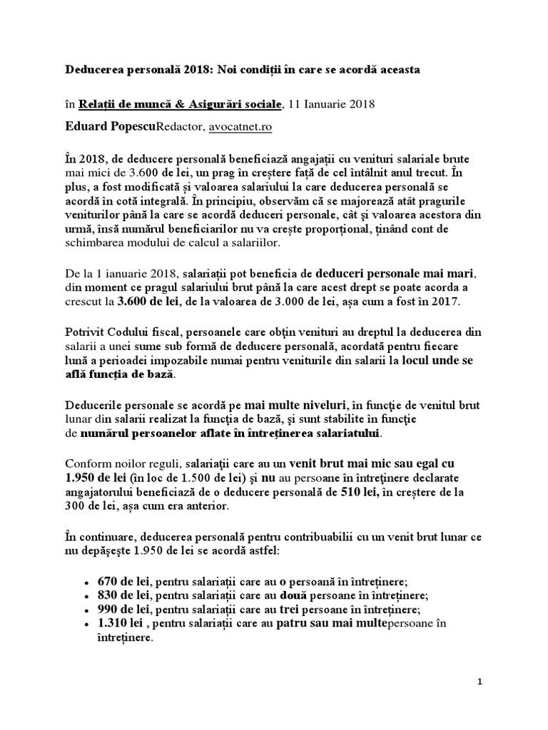 De la 1 ianuarie 2018 pragul pentru deducere creste la 3600 de lei brut, fata de odata cu oug nr. Deducerile personale sunt facilități oferite de statul român angajaților care au un salariu brut sub 3.600 de lei. La cele cu timp partial beneficiez de deduceri personale?