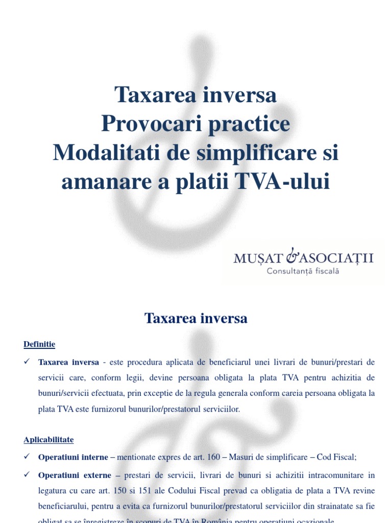 Taxarea inversă reprezintă o măsură de simplificare a plăţii taxei, aplicabilă numai între persoane înregistrate în scopuri de tva, prin care persoana ministerul finanţelor recunoaşte că atât aplicarea tva pentru achiziţii intracomunitare, cât şi taxarea inversă privind tva din anumite tranzacţii în. Articol publicat in data de: 133 (2) si achizitii intracomunitare de bunuri, în cazul carora art.