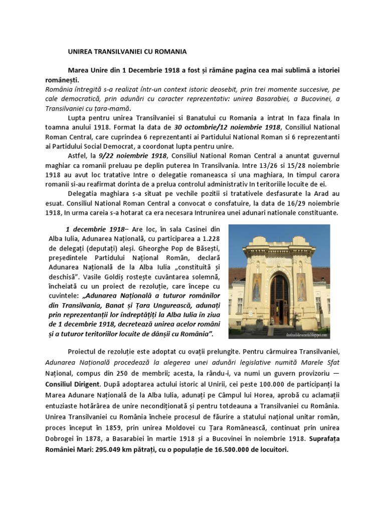 vizitati articolul complet aici : https://www.ceeol.com/search/article-detail?id=854552 The union of transylvania with romania was declared on 1 december 1918 (n.s., 18 november o.s.) by the assembly of the delegates of ethnic romanians held in alba iulia. Check spelling or type a new query. The great union day (also called unification day), celebrated on 1 december, is a national holiday in romania that commemorates this event.